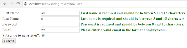 - On submitting the form the validation is done as per configuration and either the show user page (user.jsp) which just displays the entered field or the registration form with errors is displayed based on whether there are errors or not.